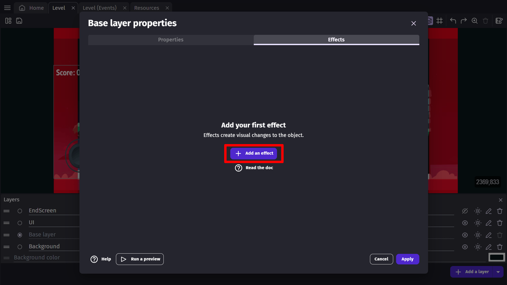 A new layer effect is named "Effect" when created. This name will be useful later for modifying the parameters of the effect during the game.