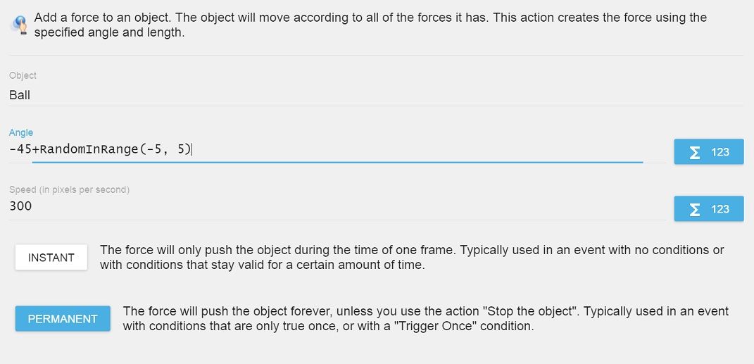 • Click Common actions for all objects > Movement > Add a force (angle).