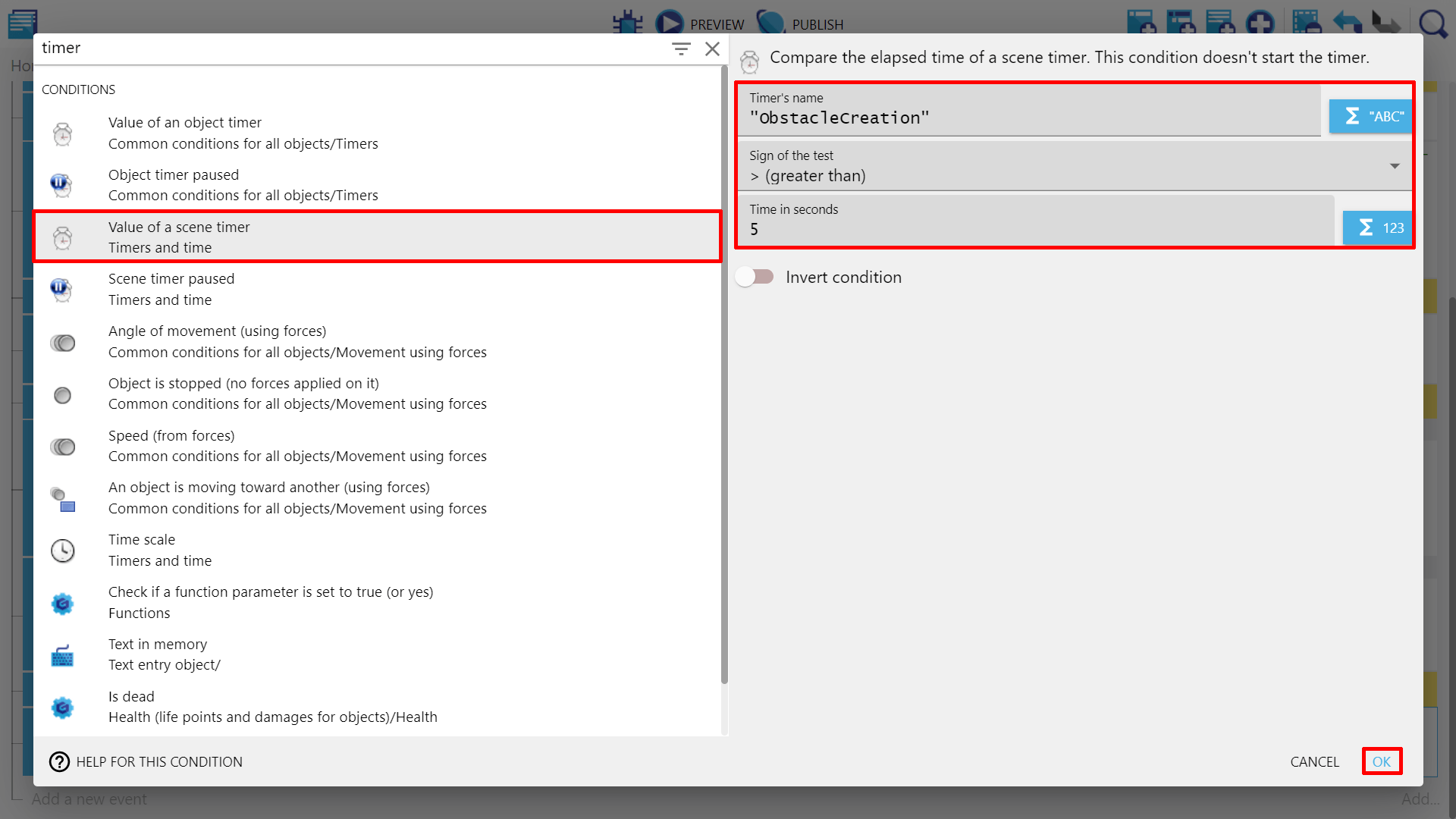 Within "Timers and time", select "Value of a scene timer". In the right panel, enter "Time in seconds" which will be 5, select "greater than", and enter "Timer's name" as "ObstacleCreation".